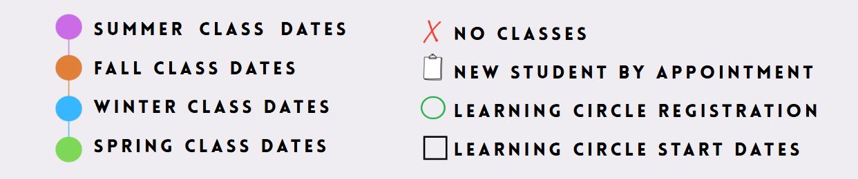 November 2025November 4: Last Day Learning Circle Fall Session-ONLINE November 6: Last day of Fall 2025 Class Session November 10: New Student Registration (by appointment only) November 11: New Student Registration (by appointment only) November 17: New Student Registration (by appointment only) November 18: New Student Registration (by appointment only) November 19: Winter 2025/26 Registration CLOSED